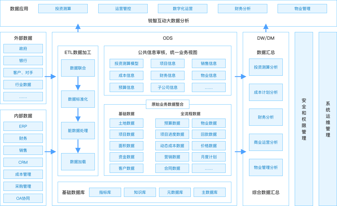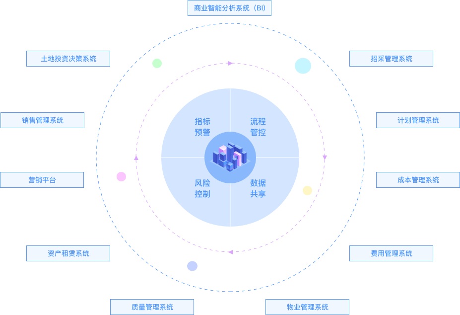 借助大数据、BI、AI 技术,构建基于数据驱动的房企经营分析平台,对房地产项目全生命周期的经营分析管控,通过投资测算、营销、成本计划进度监控、招商营运、物业管理等全方位的数据分析,提升企业经营管理和战略决策水平。